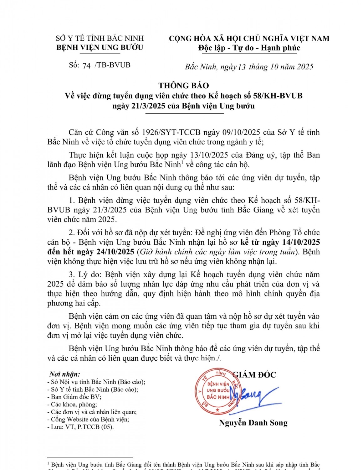 THÔNG BÁO VỀ VIỆC DỪNG TUYỂN DỤNG VIÊN CHỨC THEO KẾ HOẠCH SỐ 58/KH-BVUB NGÀY 21/3/2025 CỦA BỆNH VIỆN UNG BƯỚU