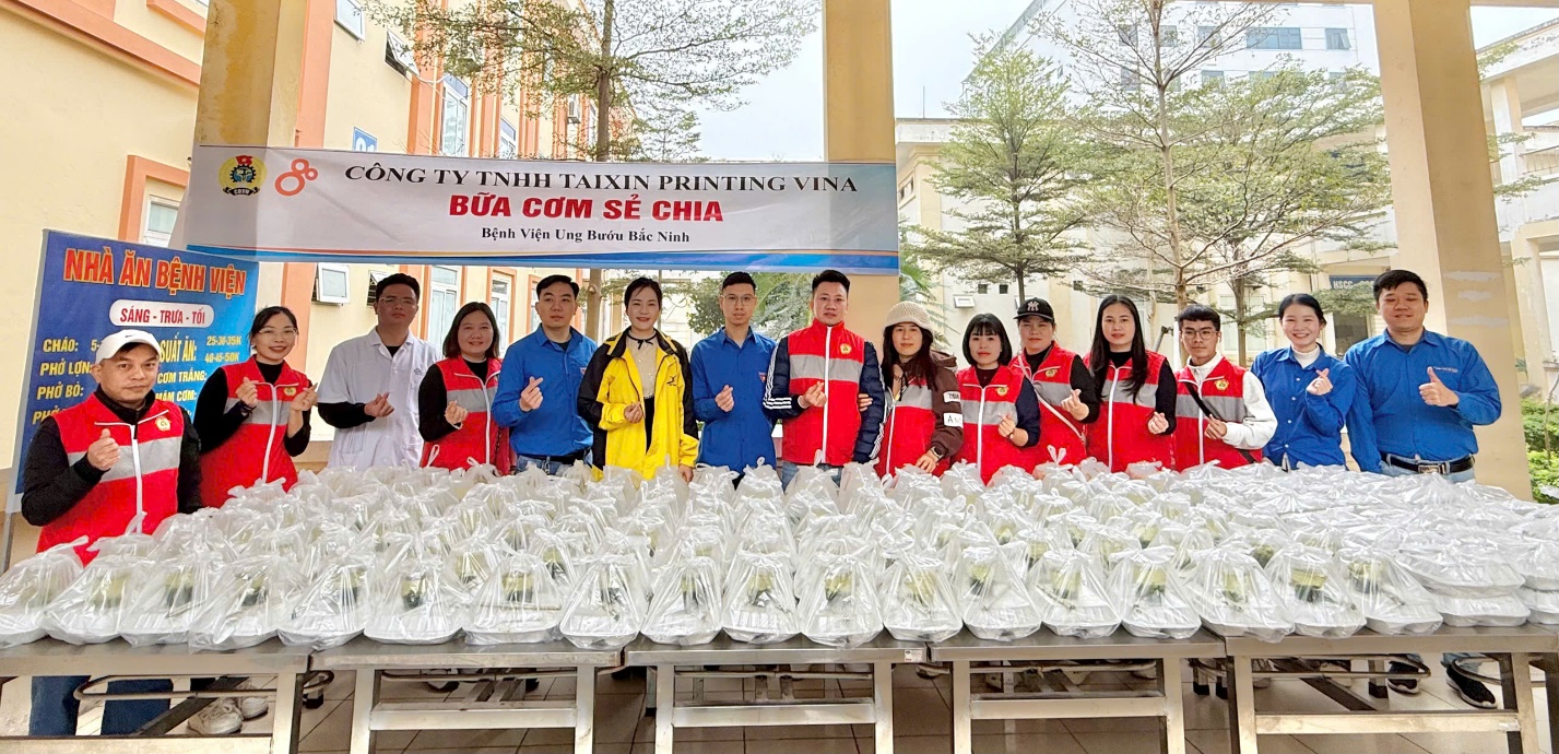 Cụ thể, Công đoàn Công ty TNHH Taixin Printing Vina đã trao tặng 350 suất cơm (trị giá 30.000 đồng/suất), với tổng giá trị 10.500.000 đồng, góp phần sẻ chia bữa ăn ấm áp, tiếp thêm năng lượng cho người bệnh trong những ngày điều trị. Bên cạnh đó, Công ty TNHH May Tân Kỳ đã trao tặng 100 suất quà, mỗi suất gồm 01 áo phông và 20 chiếc khẩu trang, trị giá 100.000 đồng/suất, với tổng giá trị 10.000.000 đồng. Những phần quà giản dị nhưng chứa đựng sự quan tâm chân thành, tiếp thêm sự ấm áp và động viên tinh thần cho người bệnh. Tổng giá trị quà tặng trong ngày trao tới người bệnh là 20.500.000 đồng.