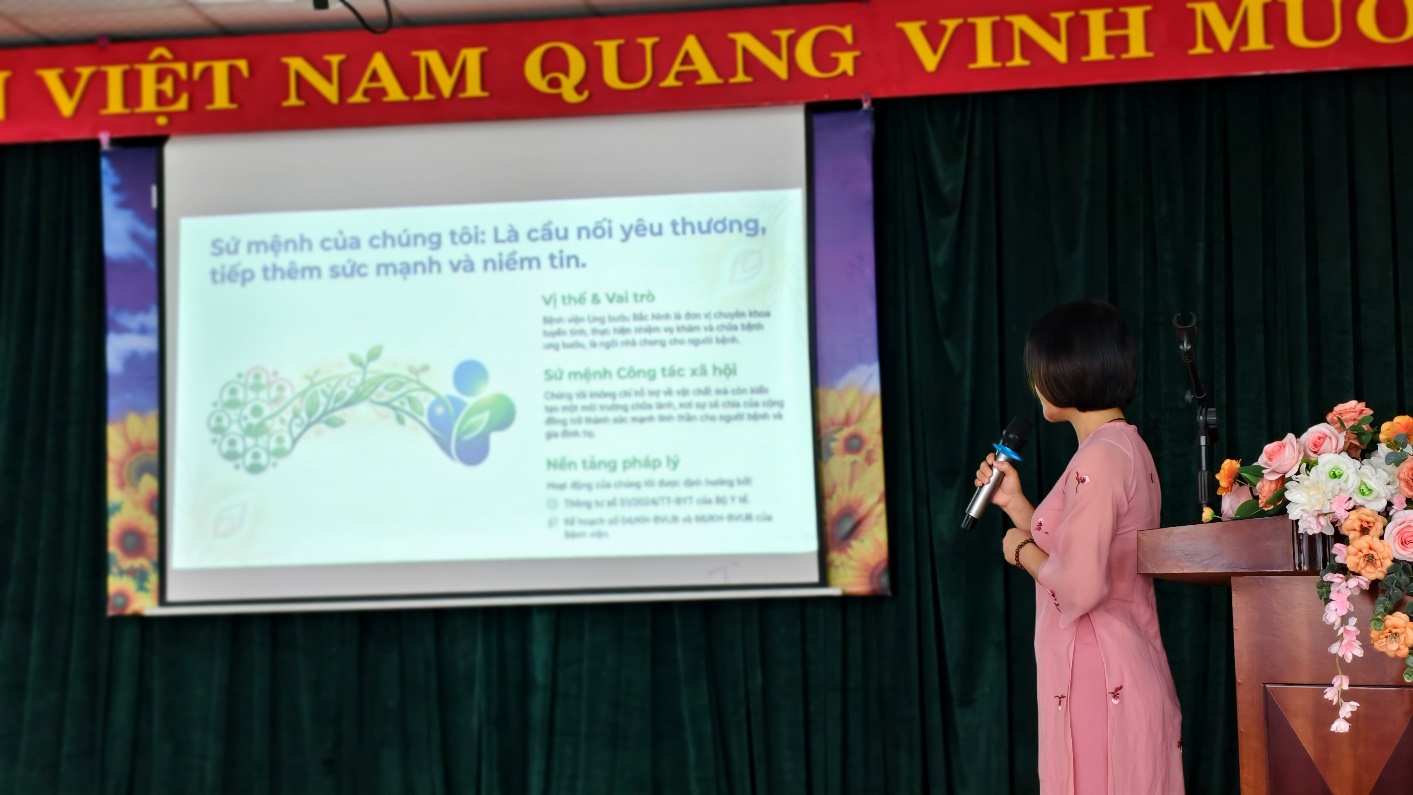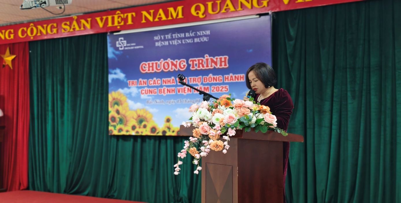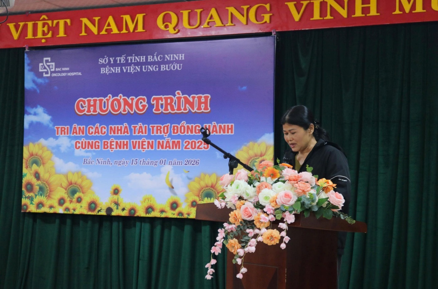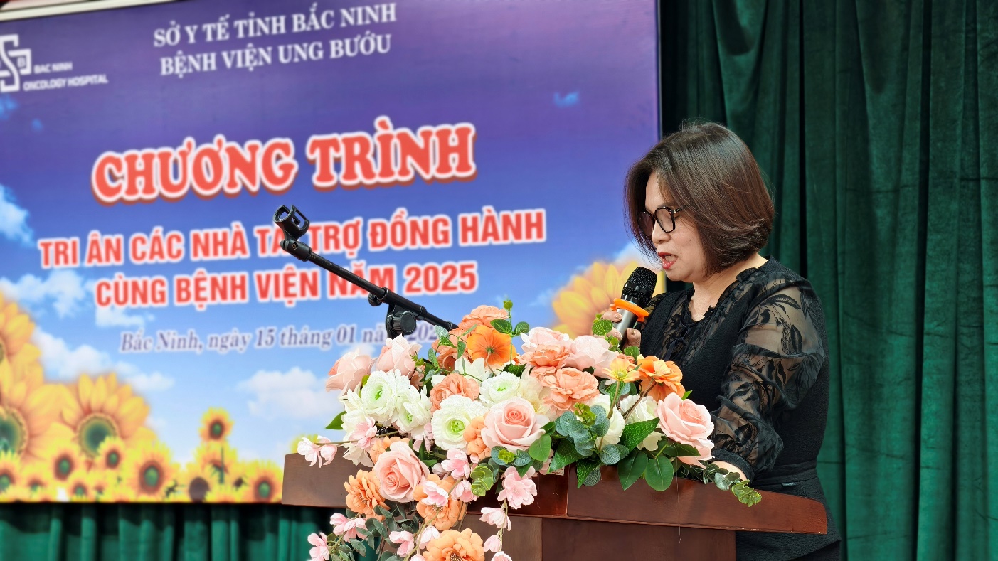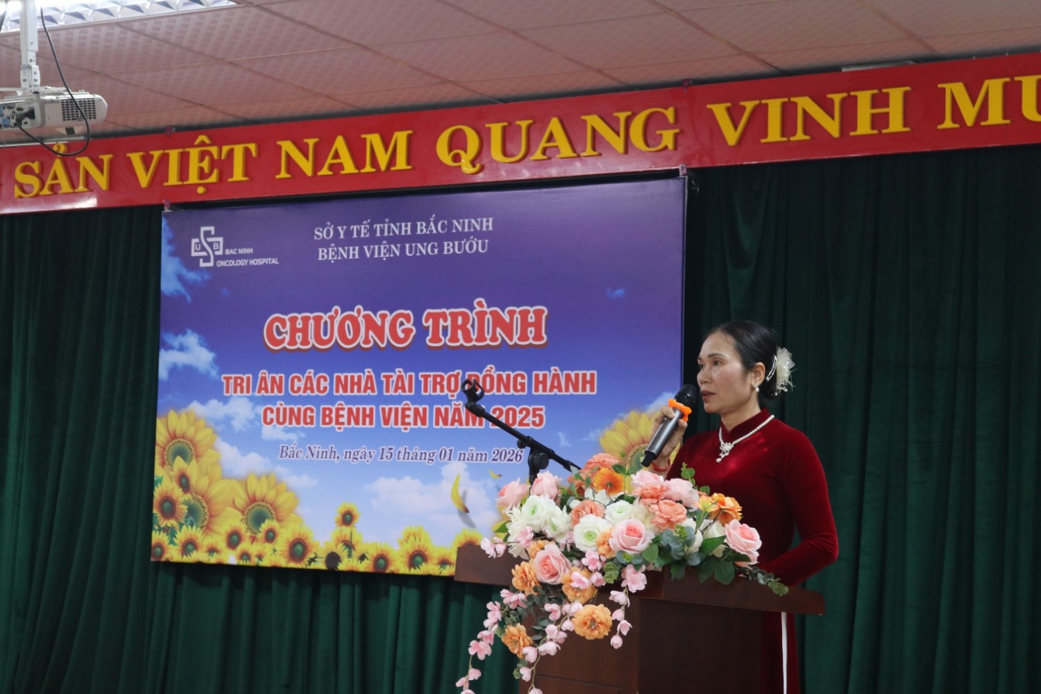 Phát biểu tại buổi tri ân, Bác sĩ CKII Lê Thị Hương - Phó Giám đốc Bệnh viện Ung bướu Bắc Ninh trân trọng ghi nhận sự đồng hành bền bỉ, trách nhiệm và đầy nhân văn của các nhà tài trợ; đồng thời khẳng định bệnh viện luôn sử dụng các nguồn hỗ trợ một cách công khai, minh bạch, đúng mục đích, đúng đối tượng, tuân thủ các quy định của pháp luật và ngành y tế. Bệnh viện mong muốn tiếp tục nhận được sự quan tâm, kết nối và đồng hành lâu dài của các nhà tài trợ trong thời gian tới, góp phần xây dựng môi trường điều trị nhân văn, thân thiện và chất lượng.
