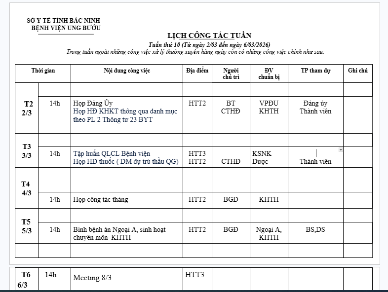 LỊCH CÔNG TÁC TUẦN 10 (2/3-6/3)