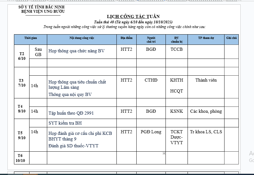 LỊCH CÔNG TÁC TUẦN 40 (6/10-10/10/2025)
