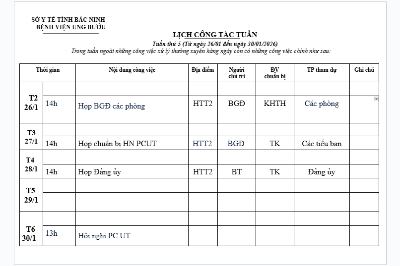 LỊCH CÔNG TÁC TUẦN 5 (26/01-30/01/2026)